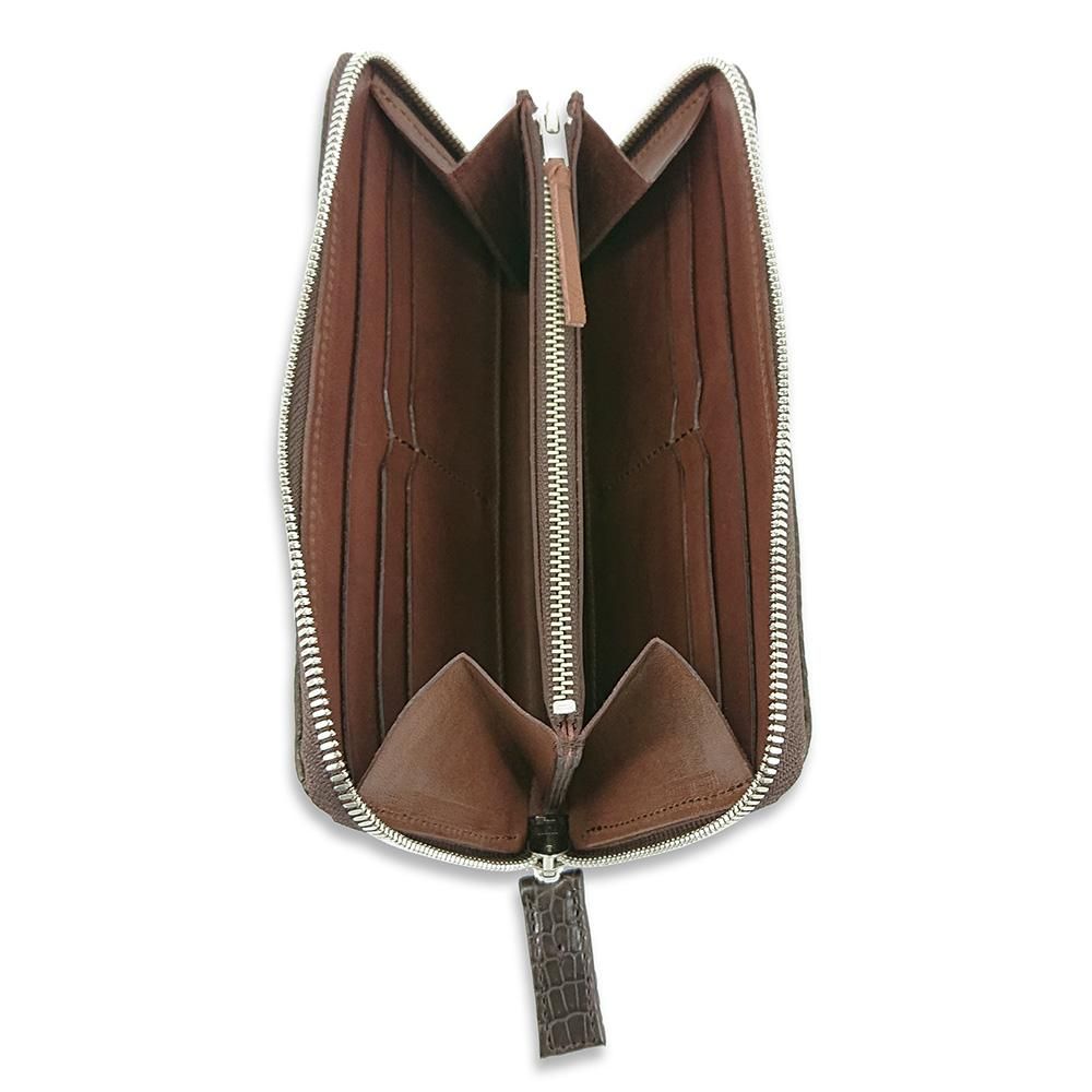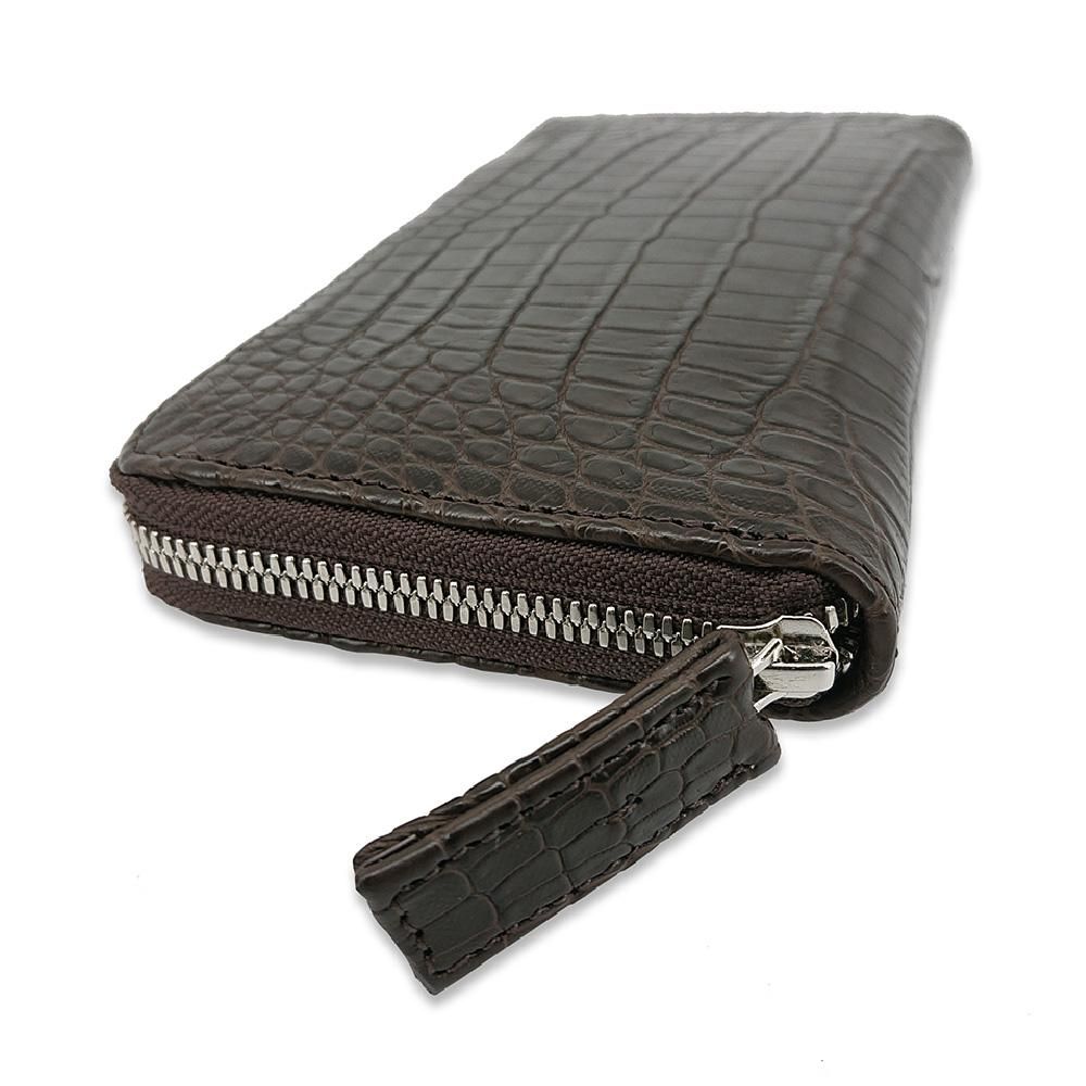 定番の形のロングウォレットですが、エキゾチックレザーの中でも特に高価なクロコダイルを贅沢に使用したモデルです。ファスナーのノブにもクロコダイルを使用するこだわりが見られます。