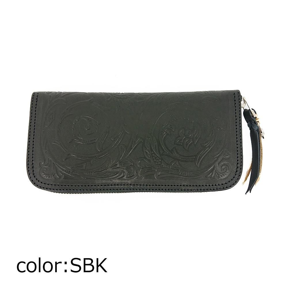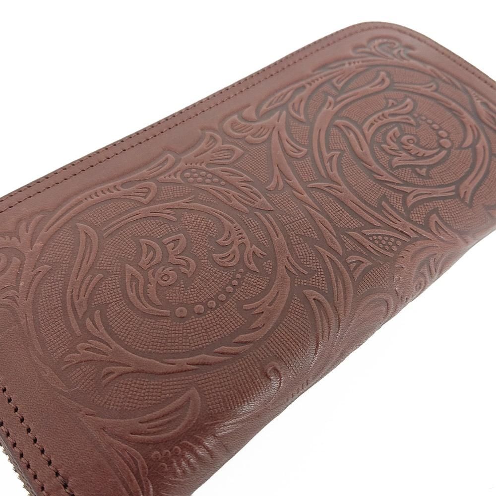 オリジナルサドルレザーを使用し、シンプルでオーソドックスなデザインのラウンドファスナーウォレットです。フェイスデザインはフローラル模様を型押ししているので、上品な雰囲気に仕上がっています。インナーの細部もコバ仕上げをしています。ジップにはレザー製ノブを取り付けてあります。