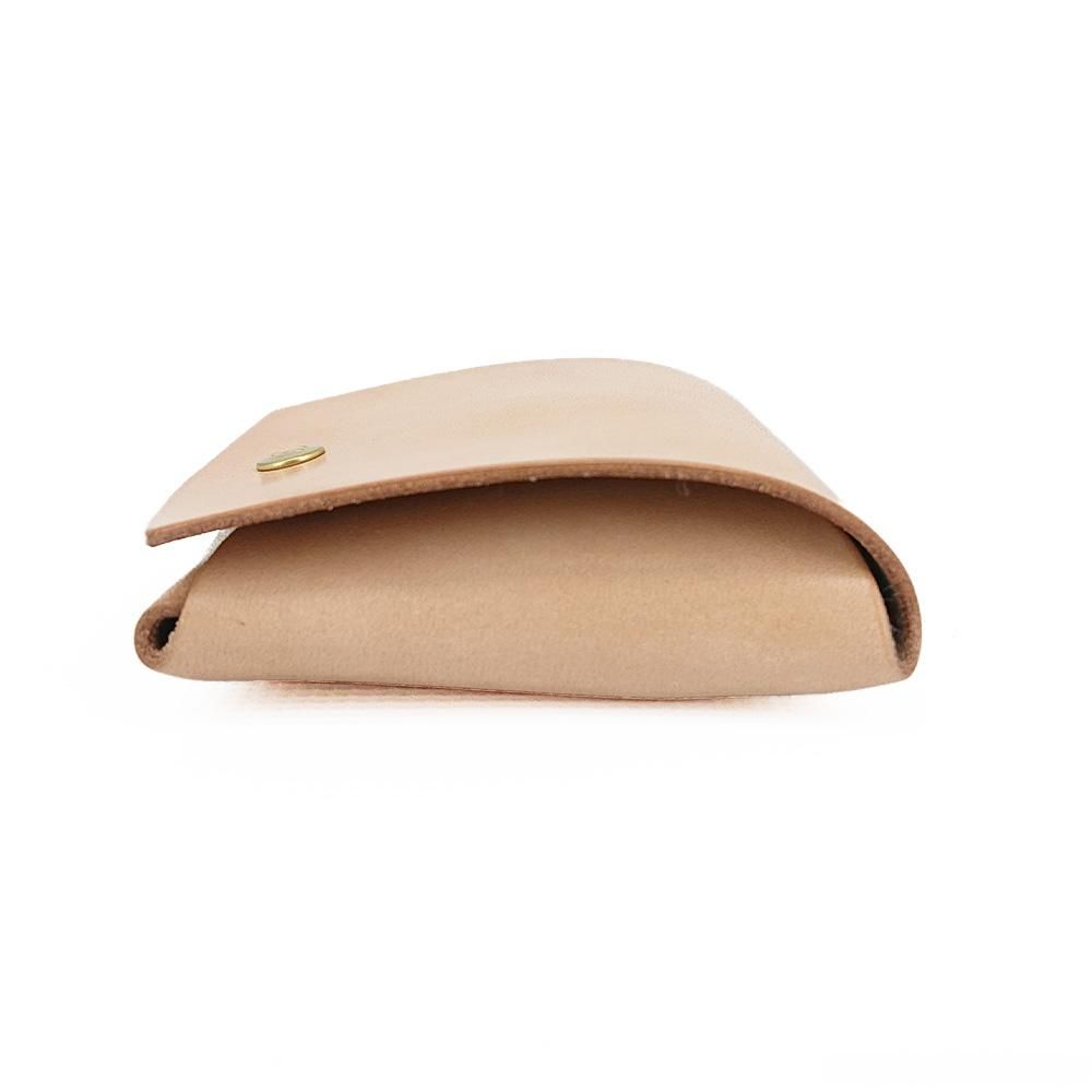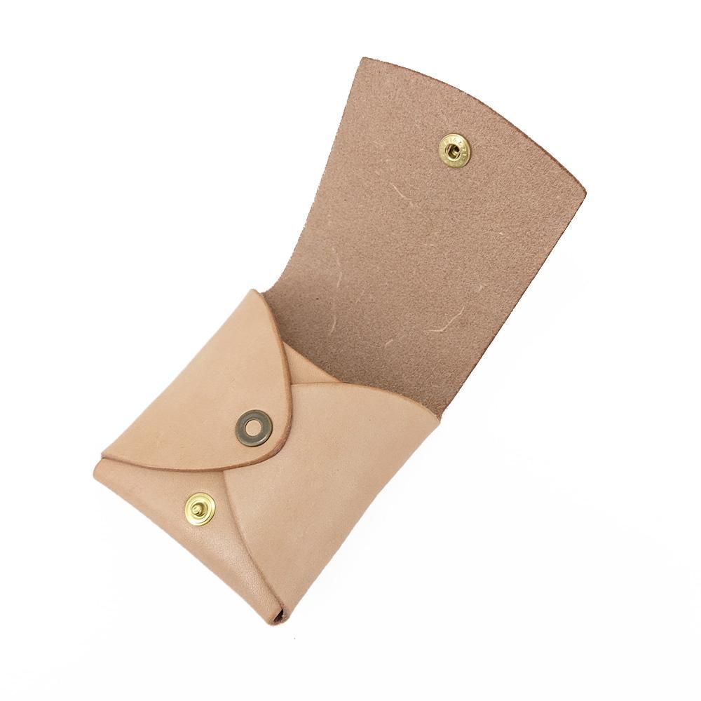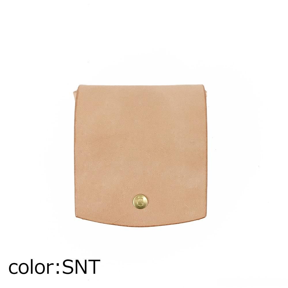 1枚革で製作されたGHOSTシリーズから発売されたコインケース。小物作成にも手を抜かず、全面コバ仕上げは勿論、裏面はスリック仕上げ。アンティークな雰囲気が漂う真鍮製のスナップボタンを用いています。コインは50枚以上は収納可能です。