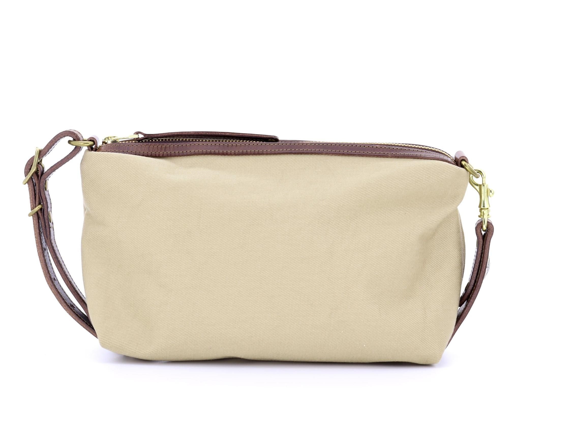 両サイドにストラップの付いたハンドポーチです。本体にはカツラギ生地を使用し、各パーツにはイタリアンレザーのマレンマを使用しています。ストラップの一方にはZ(インディアン)コンチョが装飾され、反対のストラップはバックル留めで長さ調整が可能です。本体には底マチがあるので、収納力があり、お財布やスマートフォンなどの身の回りの小物をスッキリ収納可能です。