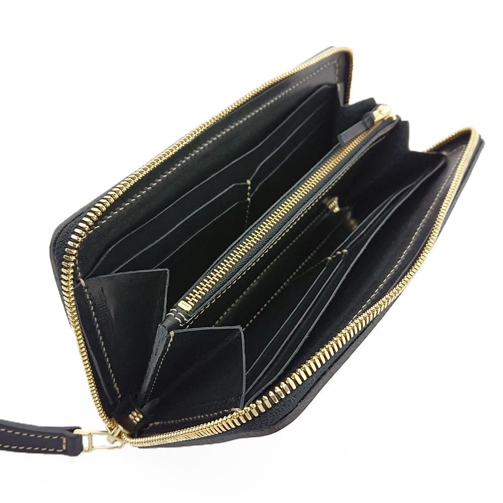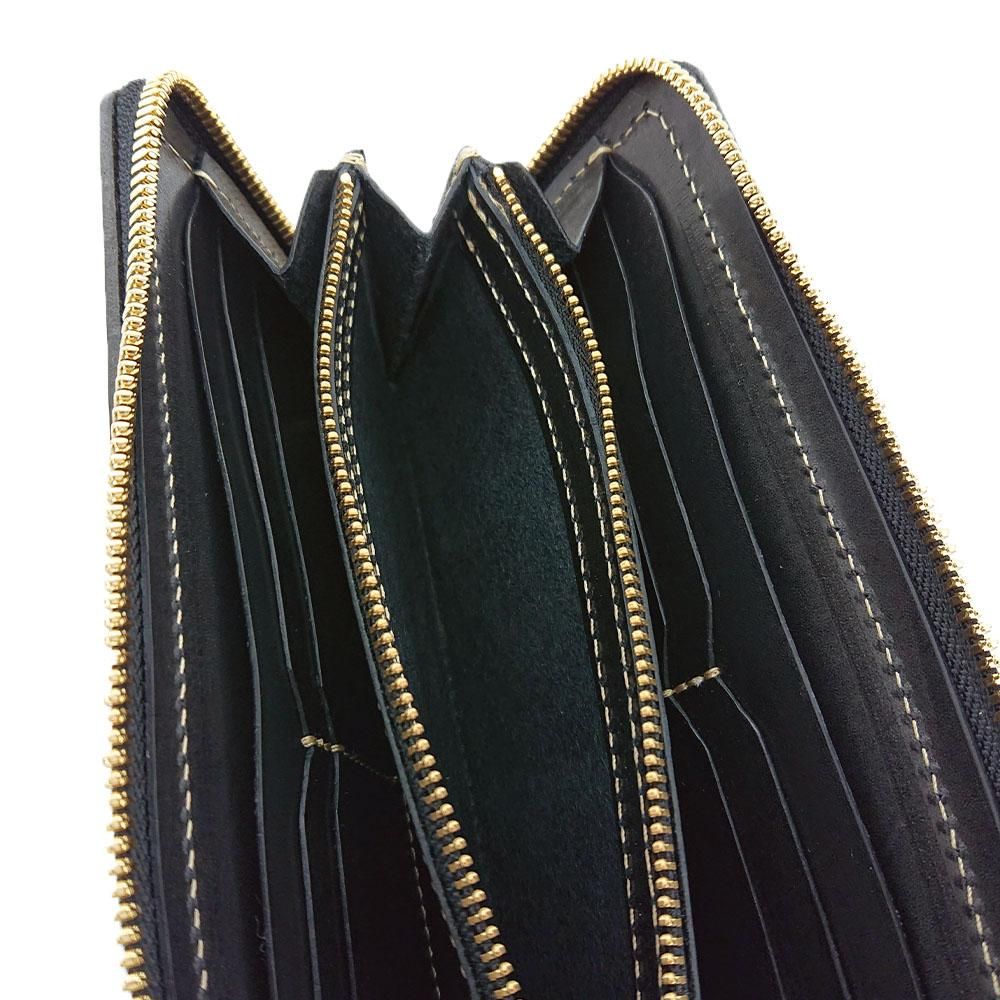 インナーにはサドルレザーを使用し、小銭入れが1か所、札入れが2か所、カードホルダーが8枚分、フリーポケットも2か所あり、収納力のある使いやすいデザインになっています。