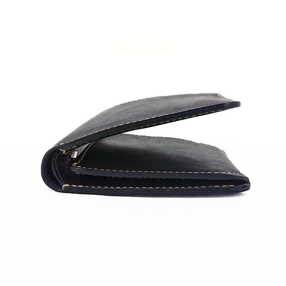 小銭入れは表の革を折り返してして仕立てた一体構造で、L型ファスナーで口が大きく開くようになっています。カードポケットは斜めに出し入れ可能で、最大10枚ほどのカードが収納できます。お札入れも仕切りが付いて、使いやすいデザインに仕上がっています。