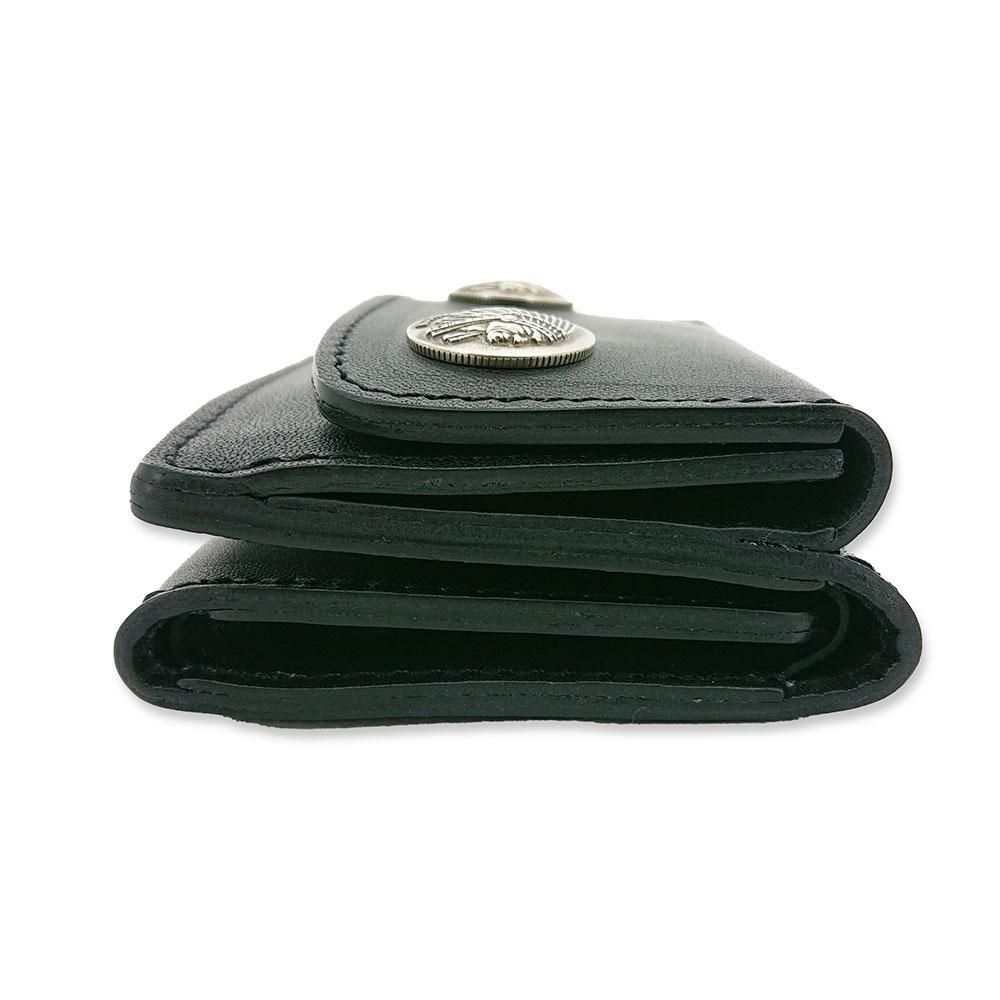 外付けのコインケースにゼットコンチョを2個装飾した三つ折り財布です。小銭入れはマチが付いて大きく開き使いやすくなっています。