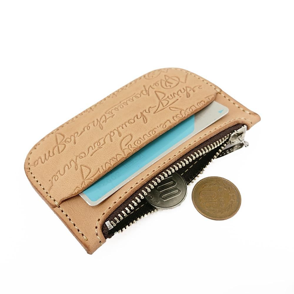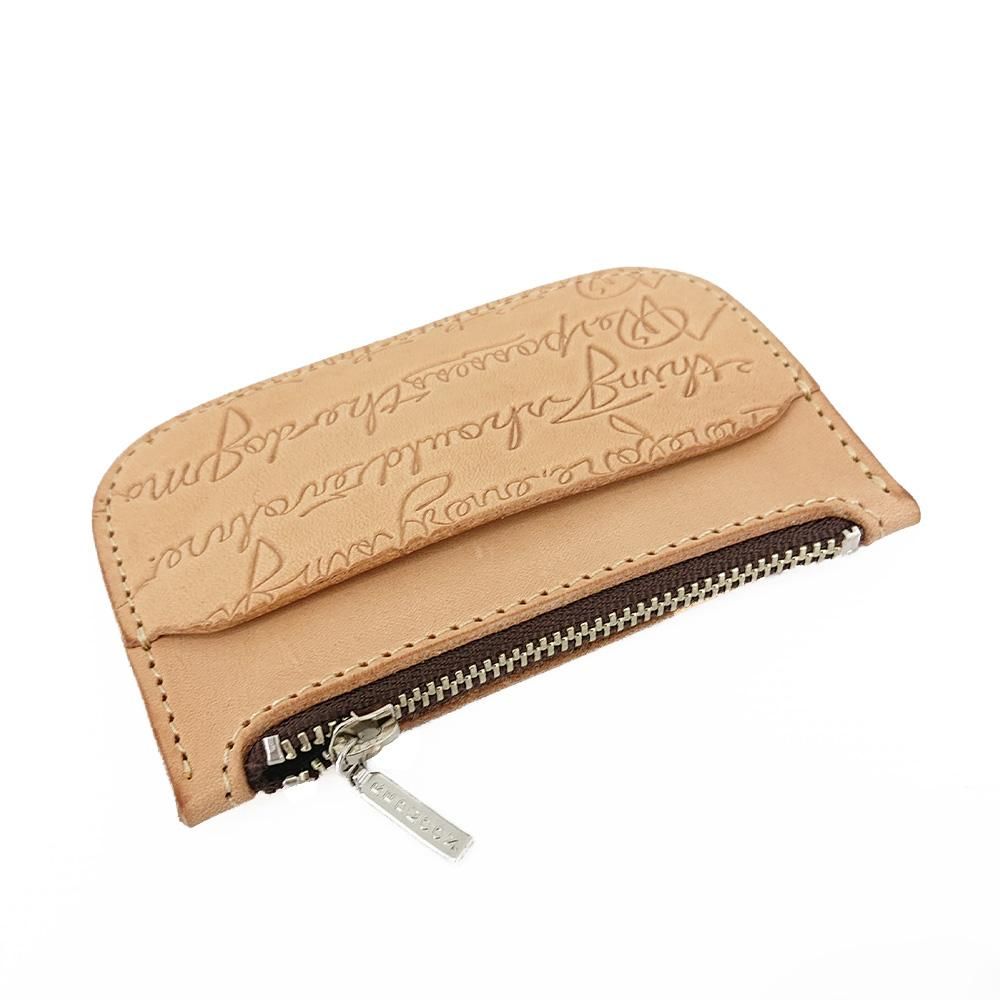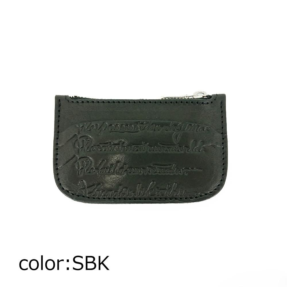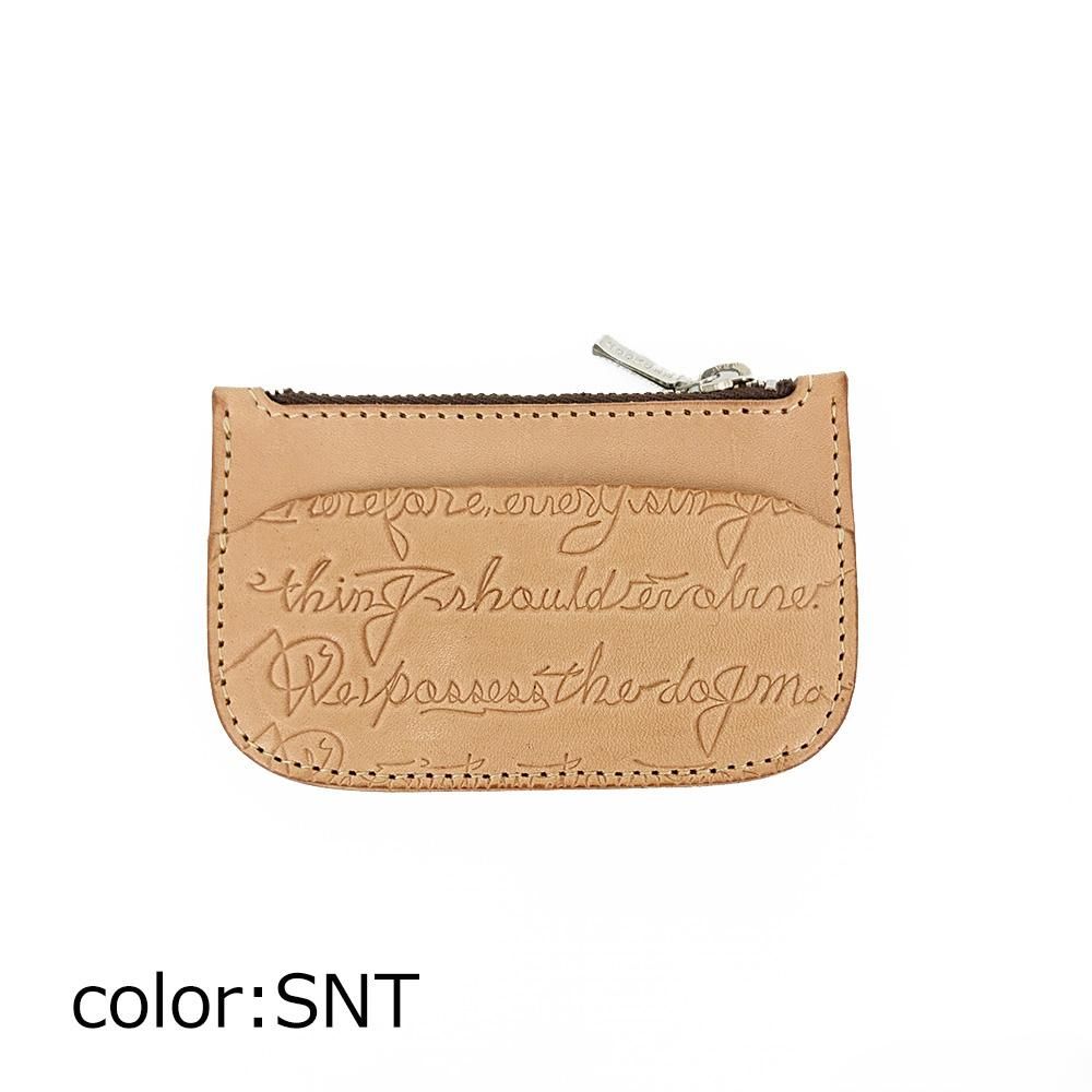 オリジナルデザインのカリグラフィが刻印されたスリムウォレットです。ファスナーポケットが1つと、外ポケットが1つ用意されています。外ポケットにはカード、ファスナーポケットには小銭が収納出来ます。